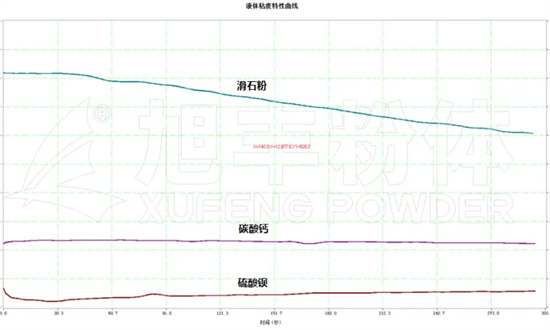 為更加清楚地闡述粉體對流體流變特性影響,如下為流變儀展現(xiàn)的,不同種類粉體的膠粘劑流變特性。以下為800目滑石粉、碳酸鈣、硫酸鋇流變特性對比情況: